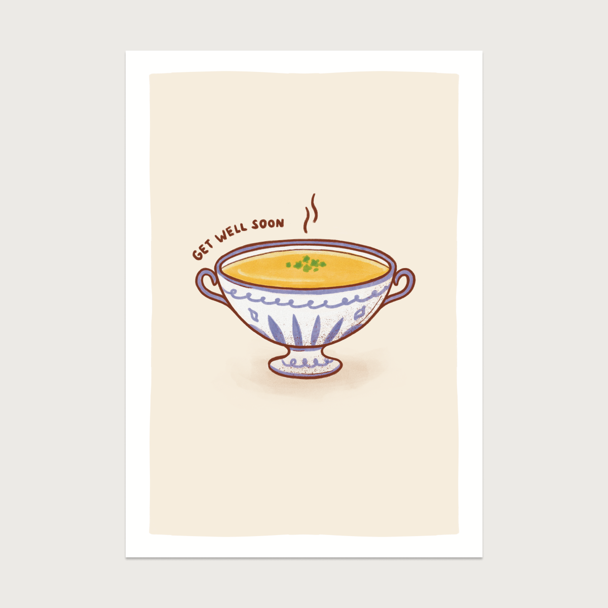 Een kaartje met geïllustreerde soepkom om iemand beterschap te wensen.
