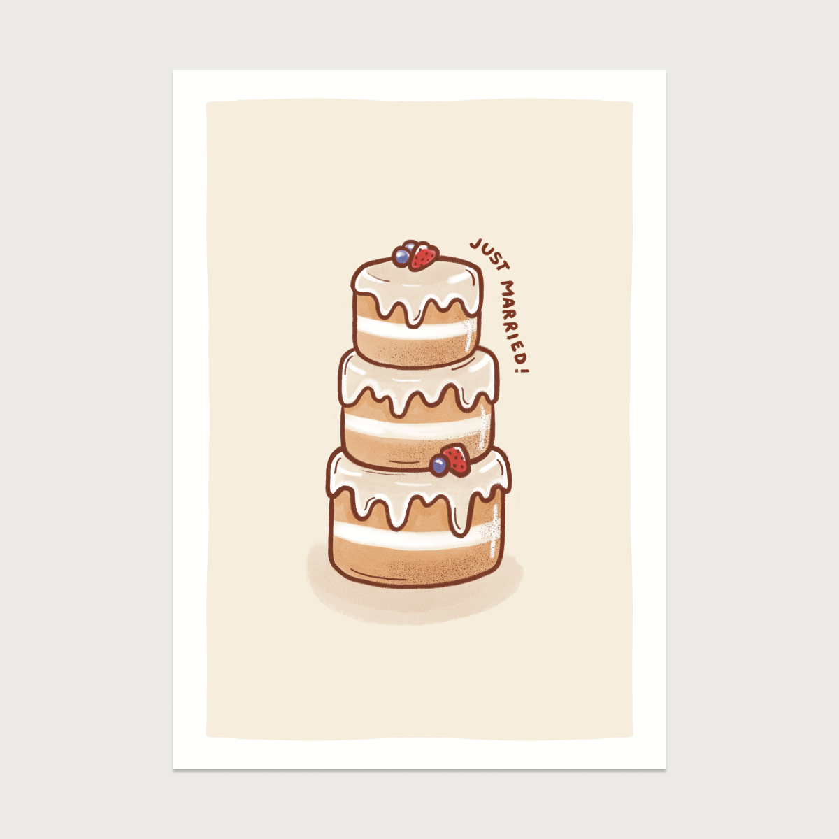 Een kaartje met geïllustreerde bruidstaart om te geven bij een bruiloft.